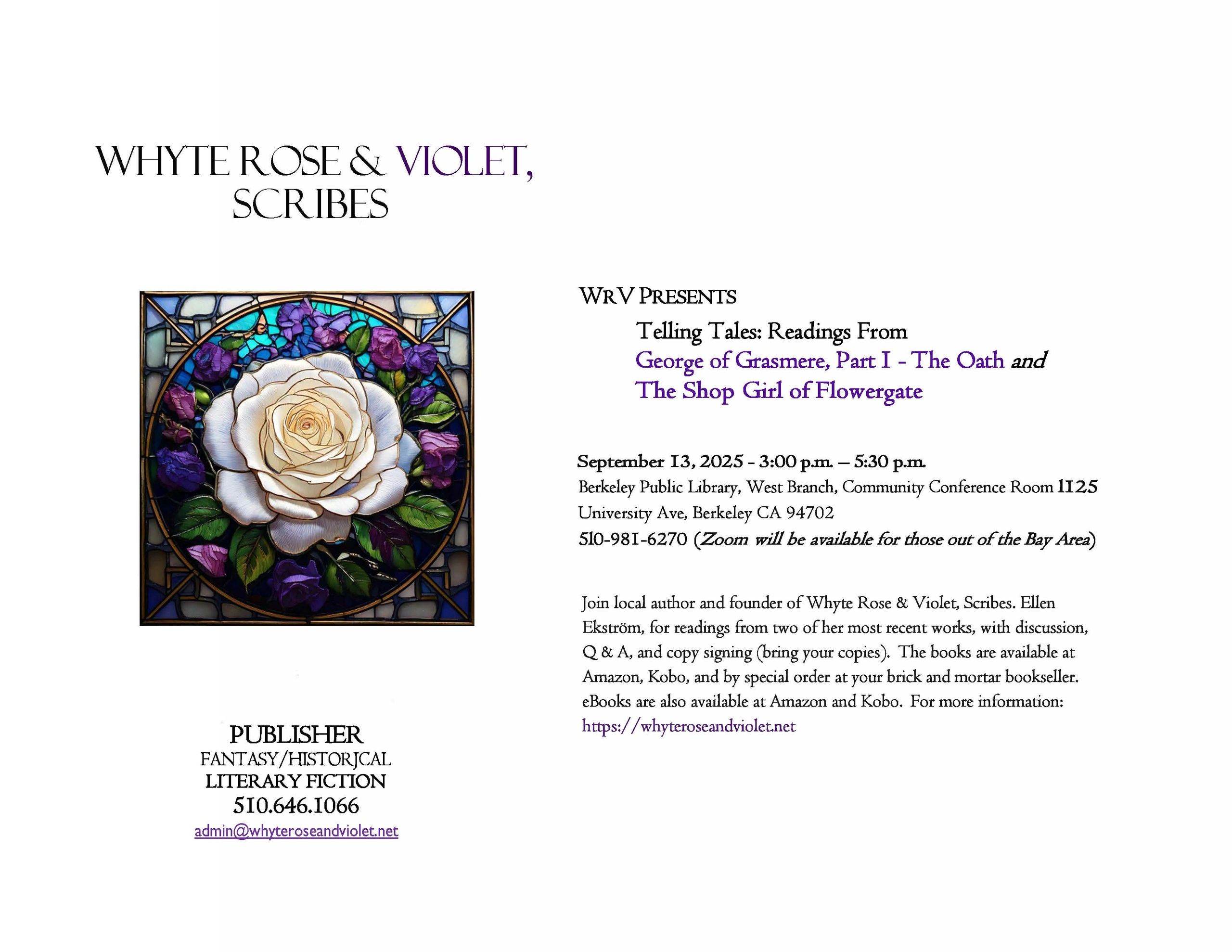Whyte Rose & Violet, Scribes ("WRV") is an independent press dedicated to fantasy, historical, and literary fiction. Founded in 2013, WRV at whyteroseandviolet.net, and its blog, Thoughts Aloud - the WRV Blog, at whyterose.net, are registered, privately-owned and maintained websites affiliated with Whyte Rose & Violet, Scribes, Publishers. They are not affiliated with any other sites in Europe, Asia, Latin America or the Middle East.